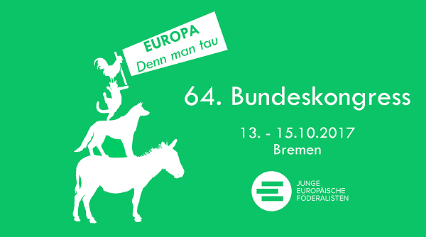 Der Bundesverband der Jungen Europäischen Föderalisten Deutschland lädt die Delegierten der Landesverbände zum 64. Bundeskongress nach Bremen ein. Das diesjährige Zusammenkommen steht unter dem Motto „Europa – Denn man tau!“, was im norddeutschen Platt so viel heißt wie „Europa – nur zu!“ oder im englischen „Go ahead!“.