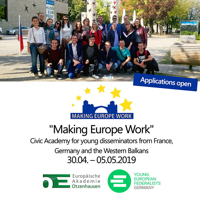 The project „Making Europe work“ brings together young motivated Europeans and their organizations from the Western Balkans, France and Germany and focuses on ways to enhance civil society cooperation in and between these regions. Which challenges do politics and societies face in the light of recent developments in Europe? What are the options for future European cooperation between the EU and non-EU Member States? What is the role of the young generation and what possibilities exist to be active in those fields? The Franco-German motor and the Western Balkans, a European region of crisis and opportunity, are of central importance in this context.