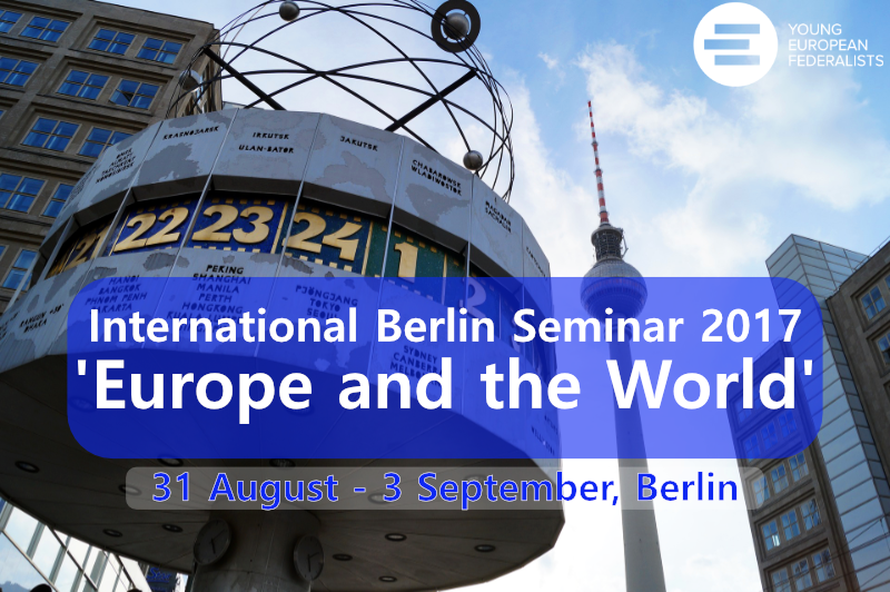 APPLICATION OPEN! We are happy to announce that from 31.08. to 03.09.2017, JEF Germany will host the 18th edition of the famous International Berlin Seminar! Taking place in Berlin, the seminar gives you the chance to meet interesting people from over 20 countries for four intense days of discussion, street-ralleys, workshops, seminars and social events! This year’s edition of the International Berlin Seminar will focus on the topic “Europe and the World”.