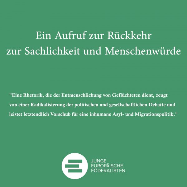 Als Bundesvorstand der Jungen Europäische Föderalisten Deutschland rufen wir deshalb dringend dazu auf, zu einem sachlichen Ton und einer rechtmäßigen Behandlung zurückzukehren, die der Bedeutung der Menschenleben und der Bedeutung der Asyl- und Migrationspolitik für den gesellschaftlichen und gesamteuropäischen Zusammenhalt gerecht wird.