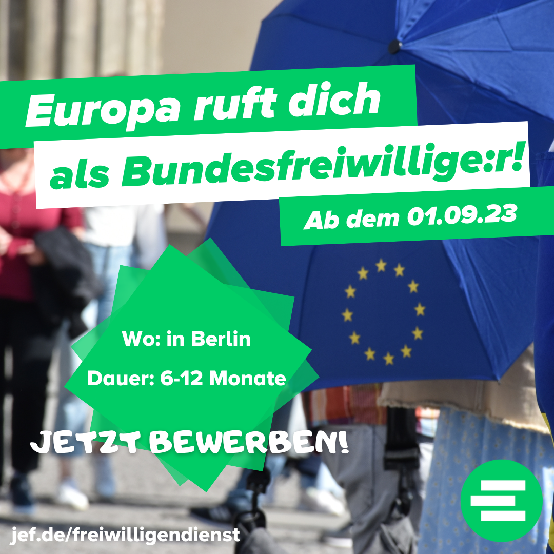 Als Bundesfreiwillige*r unterstützt du uns bei vielen Aktivitäten rund um die europapolitische Bildung. Du arbeitest gemeinsam mit erfahrenen Angestellten und motivierten Ehrenamtlichen und wirst Teil eines aktiven, proeuropäischen, überparteilichen Jugendverbands. So kannst du dich mit uns auf verschiedenste Weise für ein geeintes und demokratisches Europa einsetzen. Durch die Arbeit bei der JEF erhältst du Einblicke in verschiedene Organisationsstrukturen und wirst die tägliche Bildungs-, Kampagnen und Politikarbeit aktiv mitgestalten. Die Aufgaben sind enorm vielfältig – von der Planung und Durchführung internationaler Jugendbegegnungen über die Organisation von Gremiensitzungen oder Straßenaktionen bis zu inhaltlicher, politischer Arbeit! Ein Schwerpunkt unserer Aktivitäten wird unsere Kampagne EurHope zur Europawahl 2024 sein!