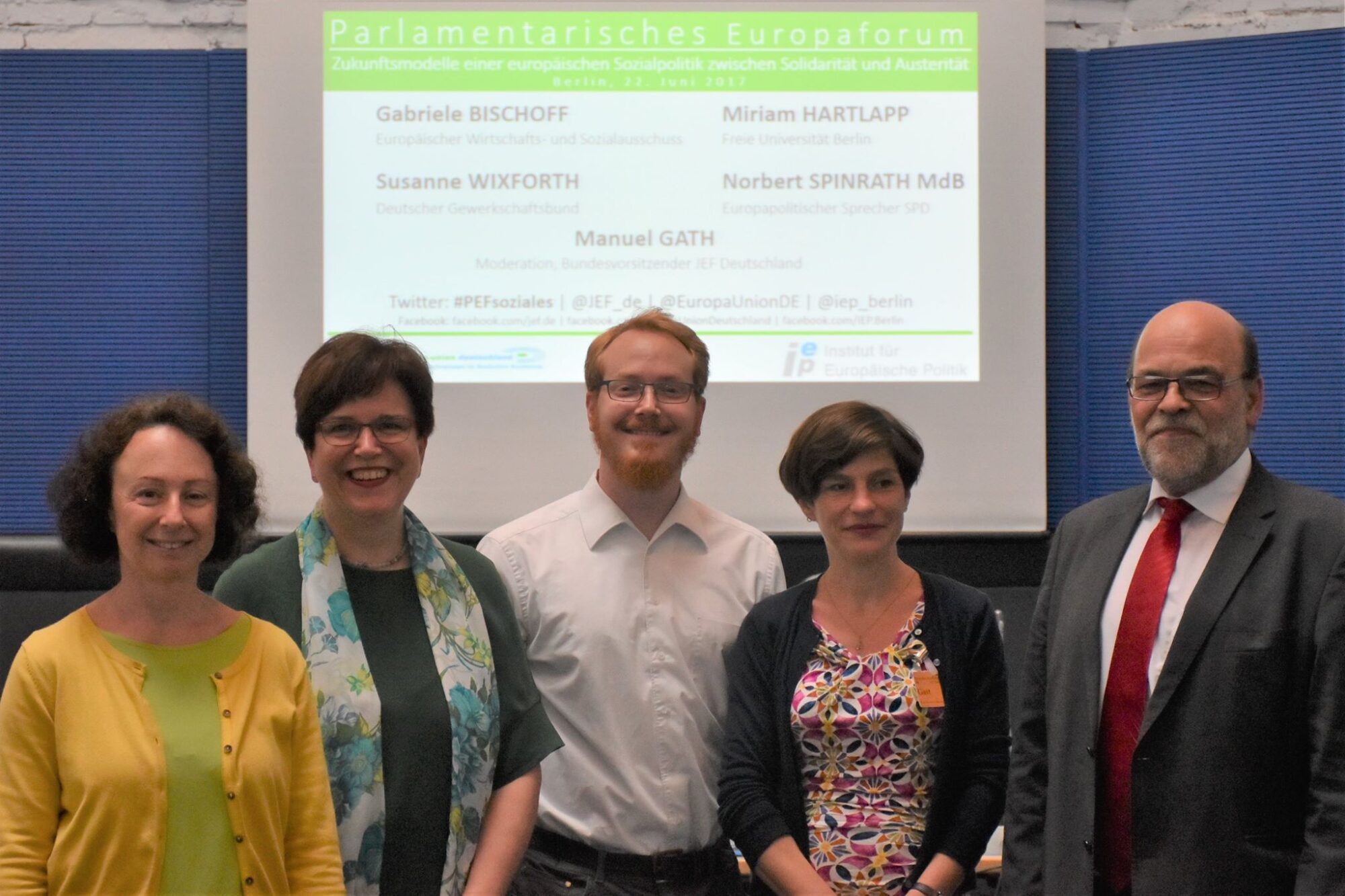 Am 22. Juni 2017 fand zum dritten Mal das Parlamentarische Europaforum der JEF statt. An der Organisation waren ebenso die Parlamentariergruppe der Europa Union im Bundestag, die Europa Union Bundesgeschäftsstelle sowie das Institut für Europäische Politik beteiligt. Unter dem Motto Europäische Sozialpolitik diskutierten Referent*innen sowie Teilnehmer*innen aus dem Publikum engagiert. Die Veranstaltung richtete sich dabei nach dem Fishbowl-Format.