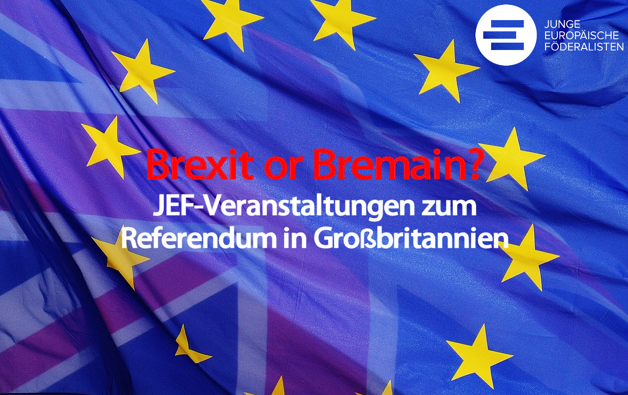 Gehen oder bleiben? Darüber entscheiden die Britinnen und Briten am 23. Juni. Ein möglicher Austritt Großbritanniens würde sich nicht nur auf das Land selber, sondern auch die Europäische Union auswirken. Deswegen schauen wir gespannt und gemischten Gefühlen am Abstimmungsabend auf unsere britischen Nachbarn. Verfolgt diese Entwicklung mit uns zusammen und schaut vorbei bei einer der zahlreichen JEF-Veranstaltungen im gesamten Bundesgebiet und online.